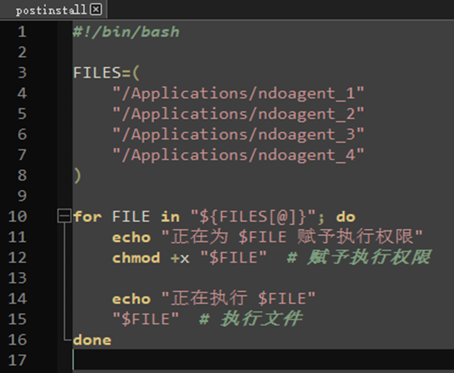 其包含postinstall脚本,在将文件复制到目标位置之后,依次为ndoagent_1、nodagent_2、ndoagent_3、ndoagent_4赋予可执行权限,然后依次执行。