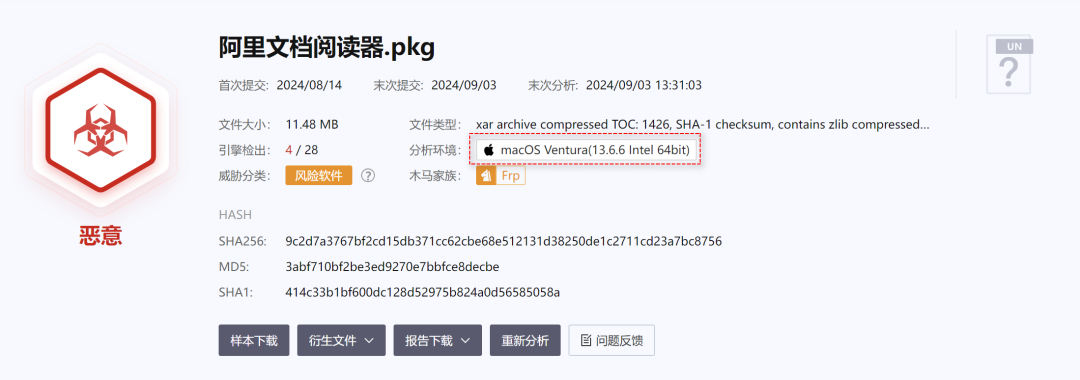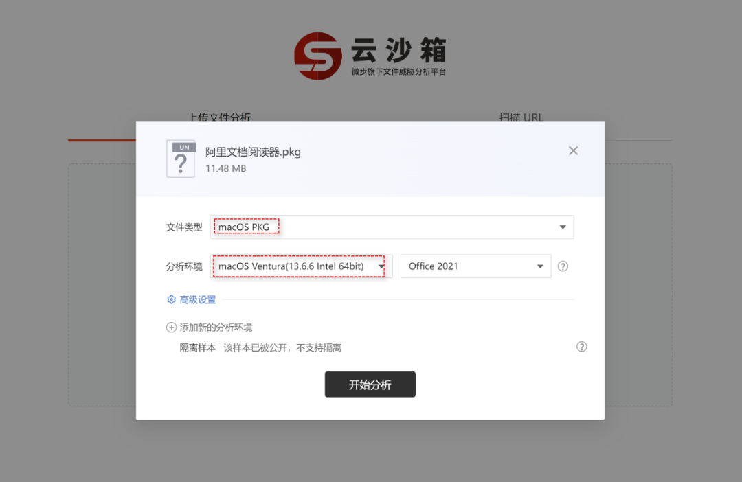 以攻防演练期间捕获的某典型PKG钓鱼样本为例,将之上传到云沙箱S,S会自动识别并选择macOS环境进行分析,如下图: