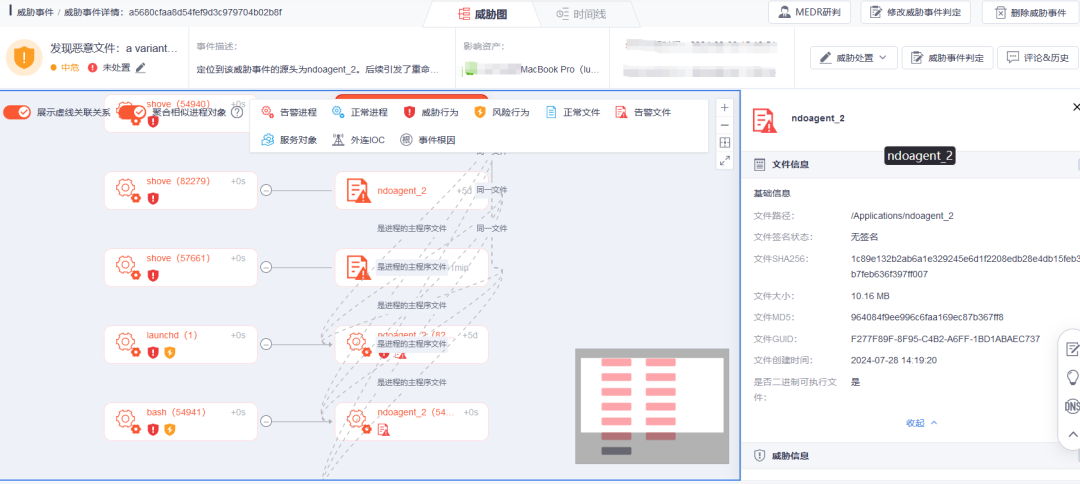 微步终端安全管理平台OneSEC Mac版EDR也捕获到该样本的多个恶意行为,如下所示: