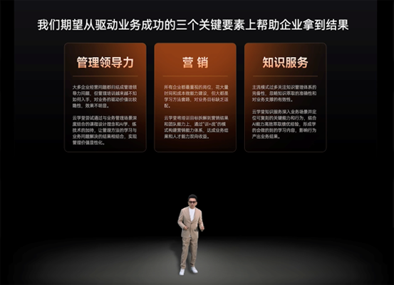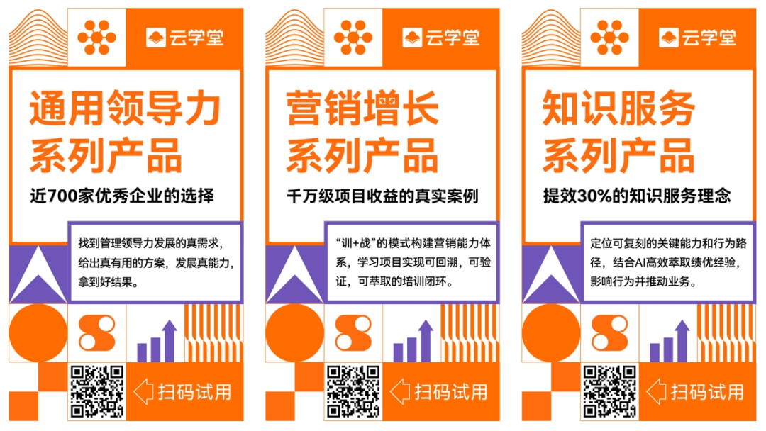 在全球经济格局重塑的浪潮中,企业如何破浪前行,实现逆势增长?云学堂在今天给出了自己答案。以“学习即增长”为核心理念,云学堂隆重推介了AI+三大系列内容产品,旨在为企业注入新的活力,引领企业在变革中寻找新的增长路径。云学堂联合创始人兼CEO祖腾先生在发布会上分享道,我们正处在一个前所未有的变革时代,“企业要想在竞争中立于不败之地,就必须要重视外部环境对企业战略、组织、人才的穿透影响,洞察业务流程,总结典型问题,提炼与归纳影响企业增长的关键因素,驱动业务成功。”云学堂此次推介的三大系列内容产品,深刻体现了在人工智能与各行各业深度融合的今天,企业持续增长的必由之路——数字化转型和业务赋能闭环的变革。云学堂的使命是通过创新驱动的课程产品,赋能企业提升效率和竞争力,共同推动企业适应和引领市场变化。一直以来,管理培训对业务的驱动价值比较隐性,效果不明显,在管理领导力系列课程的设计中,云学堂尝试通过与业务管理场景深度结合的课程设计理念,和AI学、练技术的加持,以结果为导向,重新定义了领导力的配置与应用,实现管理价值显性化。云学堂内容产品经理在产品分享中,通过“内容设置+教学设计+AI与数字化应用”的三维一体模式,展示了如何将业务成果与学习成效紧密结合。过去几年中,云学堂管理领导力系列课程服务了近700家优秀企业,深度洞察企业管理挑战,为他们提供前沿的管理培训与赋能方法,助力管理者在多变的商业环境中驾驭复杂局面,实现业绩的飞跃。营销作为所有企业都最重视的岗位,但很多的培训都是学习方法和套路,对业务目标缺乏适配。在存量竞争市场,企业营销作为业务增长的直接推手,精准营销的课程设计理念贯穿始终。云学堂针对B2B和B2C营销团队,打造了不同的营销增长闭环,帮助企业在存量市场中找到新的增长点,实现营销的突破与创新。云学堂内容产品经理讲解了大直播体系从流量吸引、流量转化、流量维护三个方面,打造不同体量的业务增长闭环,帮助企业快速进行整体能力及业务升级,在过往的交付案例中,某知名耐消品企业通过云学堂的课程,助力核心团队季度业绩破2亿+,在疫情和产业结构升级的双重压力下,实现业绩的逆势增长。当下知识管理体系主流模式过多关注体系的完备性,忽略知识萃取的准确性和对业务支撑的有效性。在企业降本增效的大趋势下,祖腾分析道,“从知识管理到知识转化的升级,可以使企业知识流转更好地产出业务结果。”知识服务系列课程,以AI技术的加持,加速了企业知识流转,推动了知识的显性化与体系化。云学堂产品经理分享道,知识服务系列课程基于组织数字化人才发展的双模式,帮助企业梳理岗位成长路径,生成岗位学习地图,通过定位优秀业务经验、提炼关键行为进行敏捷知识生产与流转,赋能业务,助组织提效!在当天的分享中,来自费森尤斯卡比中国业务培训总监姜颖和中信保诚人寿银保部培训体系规划负责人谢荟也分别向大家介绍了自身经验。姜颖强调了业务赋能和人才赋能双轮驱动的重要性,并展示了如何通过数字化和AI工具提升培训效果,以适应不断变化的市场环境。谢荟则分享了她在组织经验萃取当中,如何采取创新的方式为保险行业的人才培养注入新的活力,推动业务的持续增长。作为深耕数字化企业学习的行业领军者,云学堂十余年来不断创新,始终坚持帮助企业提升人才培养与组织能力效率,赋能业务发展,促进企业业务目标的达成。基于服务行业头部企业的经验,此次云学堂推介的AI+内容产品,不仅仅是课程的创新,更是对企业业务场景深度理解和全面赋能的体现。面向未来,云学堂将持续依托数字化学习技术,聚焦企业战略诉求,打造解码关键业务问题的培训产品与课程组合,为企业在应对外部环境挑战和实现业务增长方面提供创新思路,助力中国企业走向可持续发展的未来。