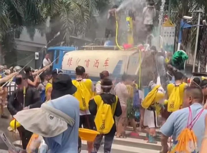 论装备,简直是一场泼水大战的“军备竞赛”,有人扛着2L的大水枪,还有人背着一个大水箱,但官方已经卷到新境界了——直接上洒水车。