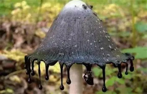 墨汁鬼伞,菌如其名,不仅浑身冒着诡异的黑光,帽沿附近甚至还吊着小珠子。路过旁边都要说声“退退退!”