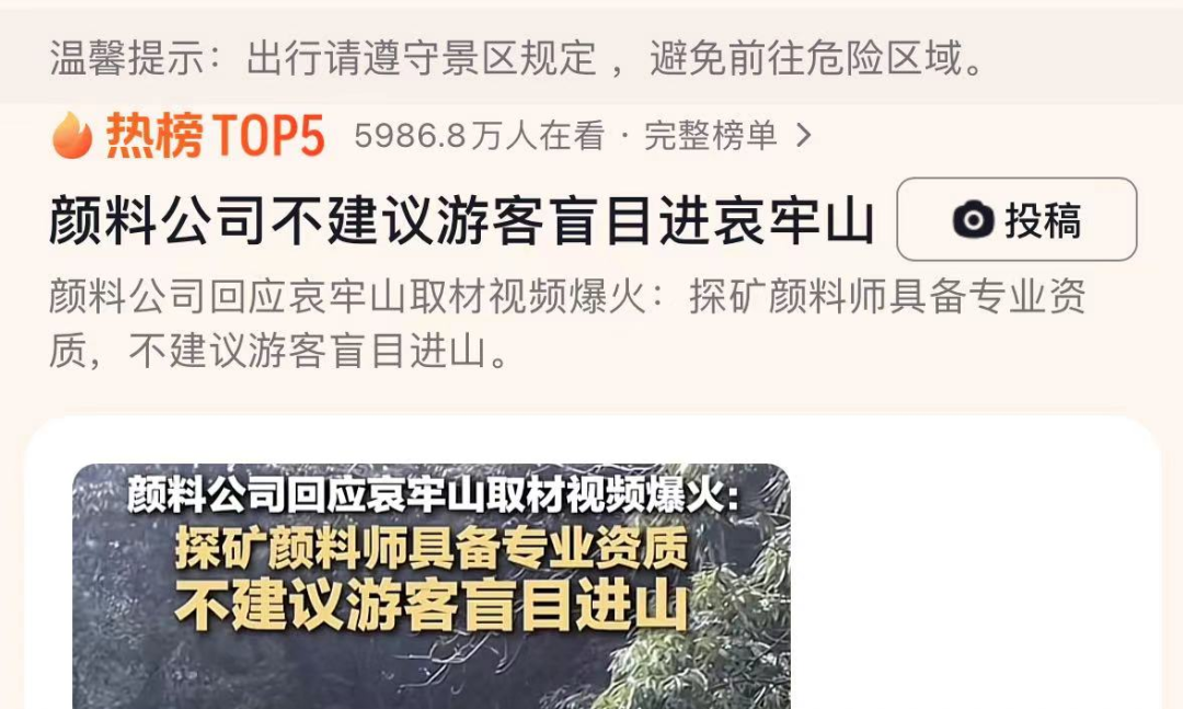 国庆当天,一个名为“山取”的颜料博主放出了自己“一人勇闯哀牢山”的视频,顿时引爆全网。