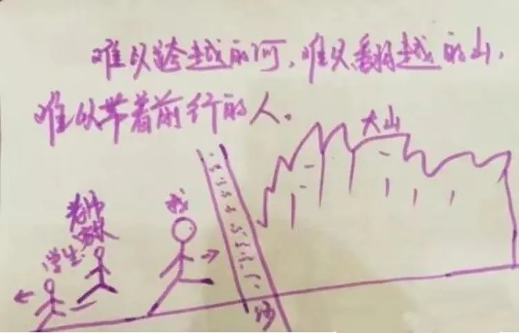 而这幅画的批注,则将这位校长的沉重压力与无奈心态清清楚楚地展示出来:“难以跨越的河,难以翻越的山,难以带着前行的人。”