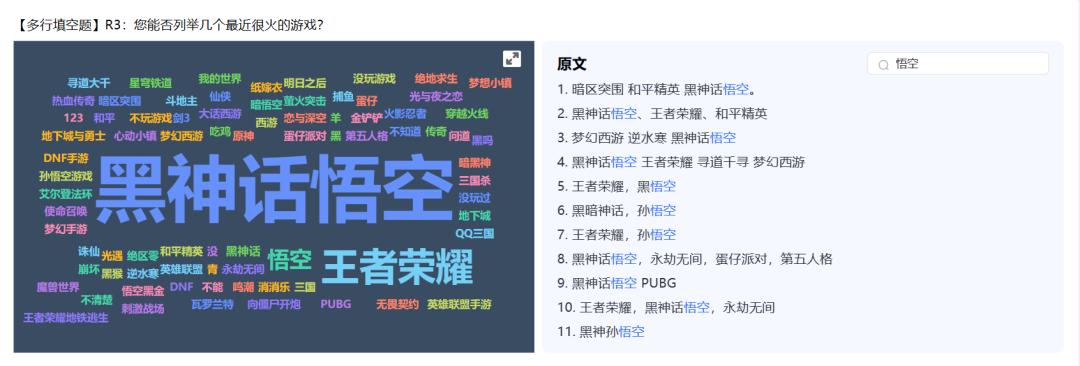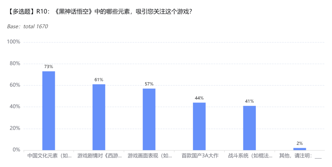 在开放回答近期很火的游戏时,35%的受访者在未经提示的情况下,主动回答了“黑神话悟空”,如果算上“黑神话马喽、悟空、黑猴”等昵称,这个数字还会更大,黑神话悟空的热度可见一斑。