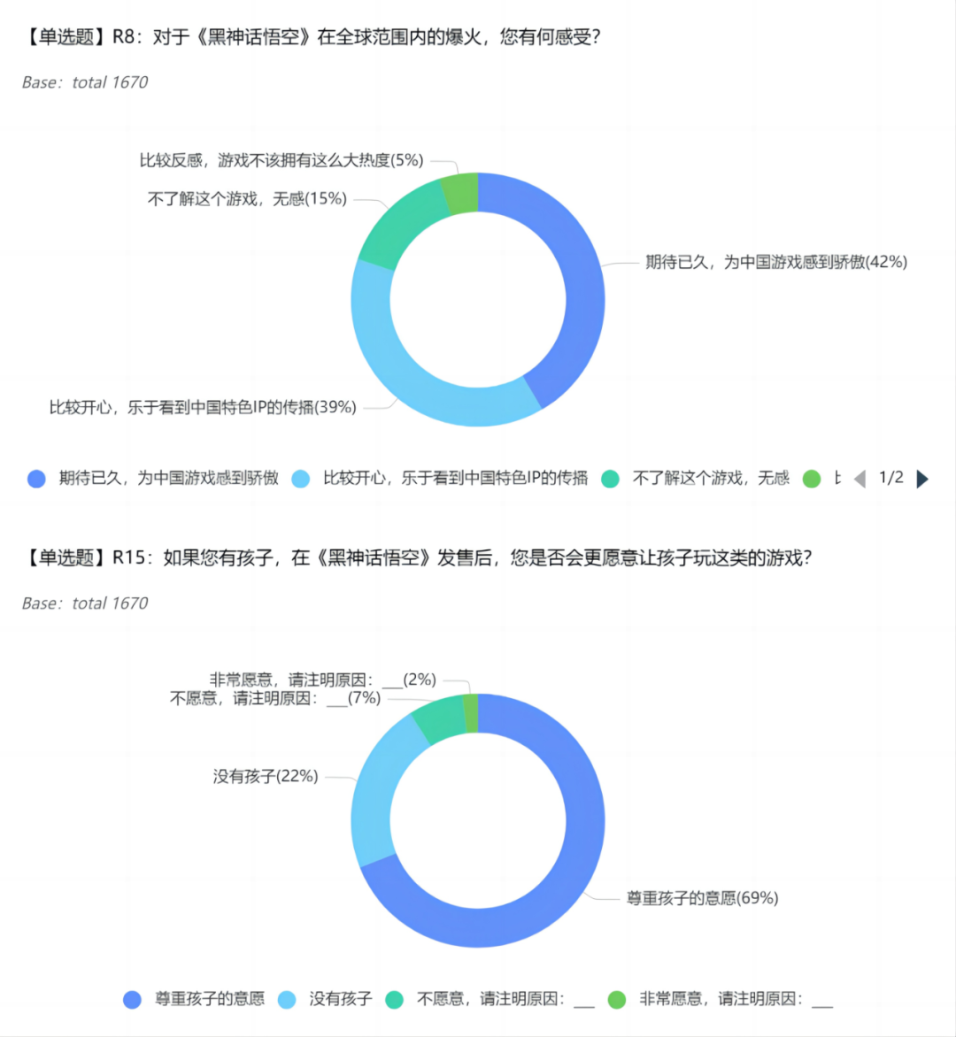 对于游戏行业来说,这可能是对既往受众人群概念的一次挑战,也许游戏公司需要进行新一轮的人群洞察,重新认识消费者。81%的受访者表达了对于黑神话悟空的期待,开心与骄傲是主流的情绪。同时,71%的受访者对于孩子玩这款游戏并没有太大的抵触,而是选择尊重孩子的选择。