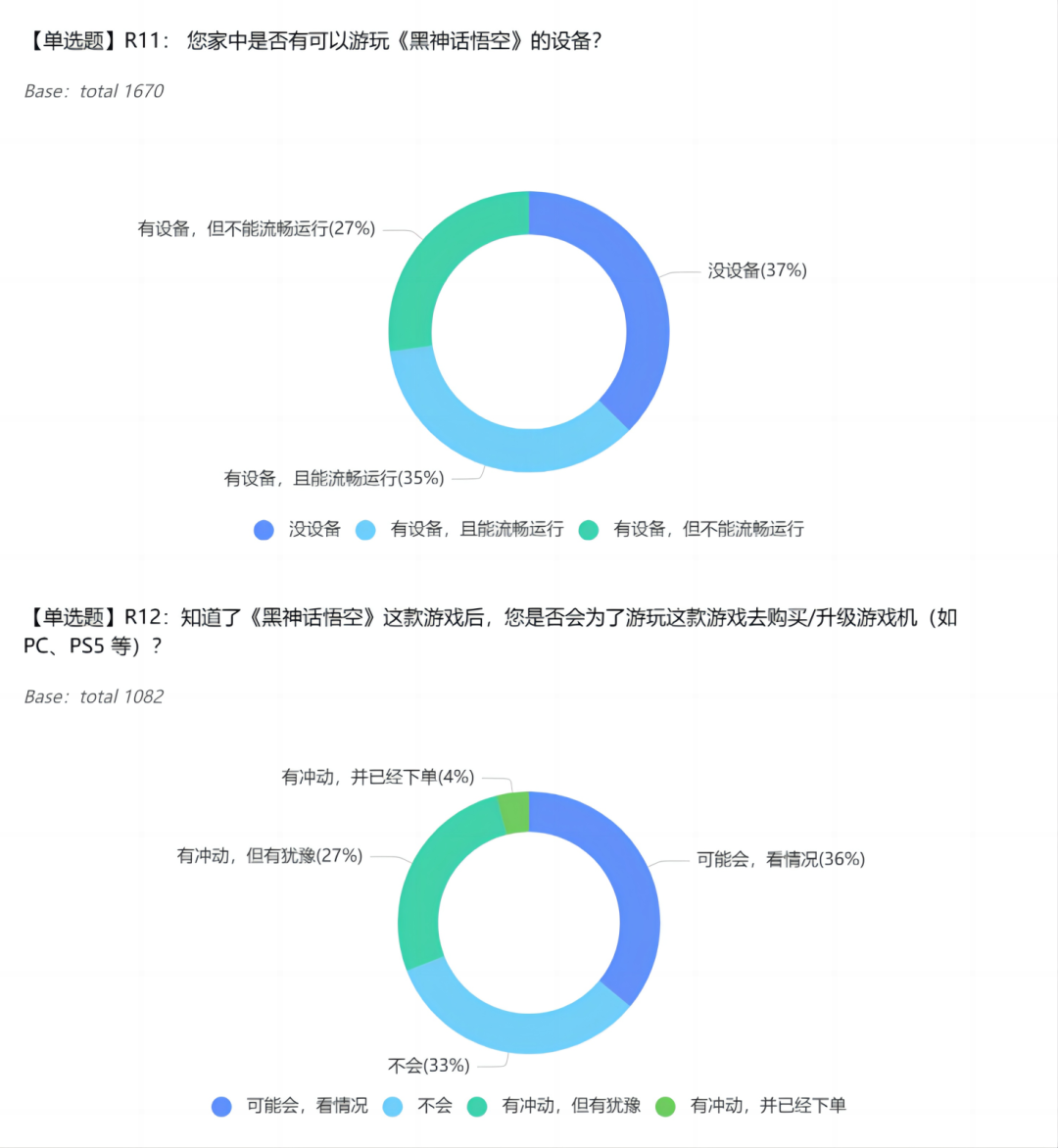 流畅游玩黑神话悟空,对于游戏设备的要求较高,64%的受访者表示,没有设备或者设备无法流畅游玩。由此也催生出升级/购买设备的需求,但只有4%的人选择立刻下单,63%的人虽然有冲动,但持犹豫和观望的态度。