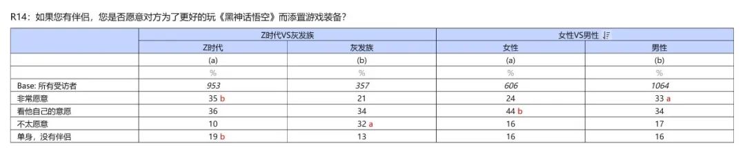 从年龄和性别的角度来看,男性受访者在升级/购买游戏设备时,会注重家人和女友的看法;如果自己的伴侣为了畅玩游戏而去升级/购买设备,他们也非常支持,看来有不少爱玩游戏的男性,都希望能拉伴侣“入坑”;女性受访者们也没有对伴侣升级/购买设备表示出太大反感,更多还是尊重伴侣的意见。所以想玩黑神话悟空的男性朋友们大胆说出自己的想法,说不定就能实现了!而比起Z世代非常愿意让伴侣在游戏上投入的态度,灰发族则不太愿意让伴侣在游戏上投入。*ab代表在95%置信度下,该数据显著高于该类别下的另一个数据