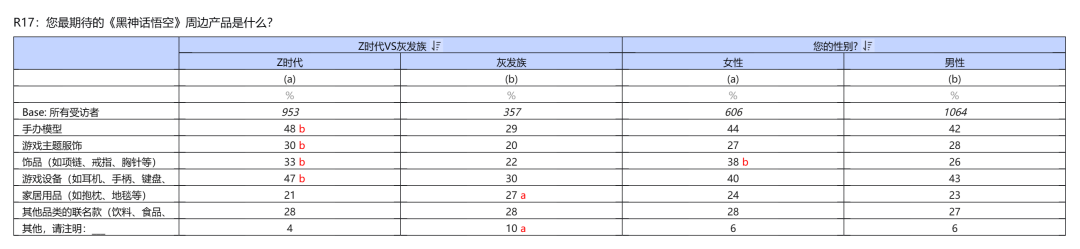 而从年龄、性别的角度来看,Z世代更喜欢手办、游戏设备、服饰和饰品;灰发族就居家的多,更喜欢抱枕、地毯等家居用品;而比起男性,女性对饰品(如项链、戒指、胸针等)表现出了更高的兴趣。*ab代表在95%置信度下,该数据显著高于该类别下的另一个数据