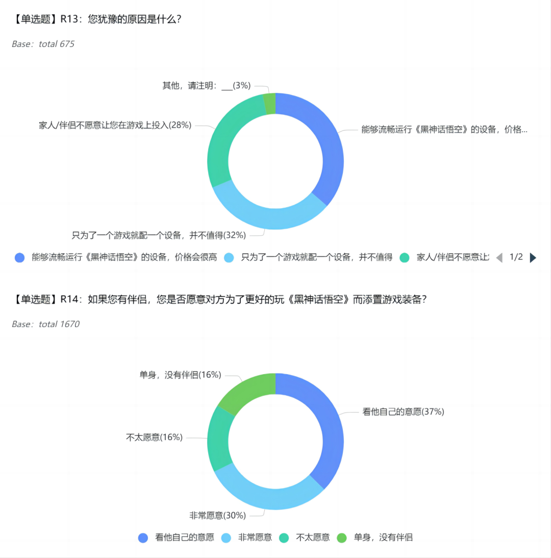 担心伴侣不支持、设备价格高昂,以及只为一款游戏就配一个设备太奢侈,是受访者们犹豫的主要原因。同时,如果自己的伴侣因为玩黑神话悟空,而有了添置游戏设备的需求,67%人选择支持。