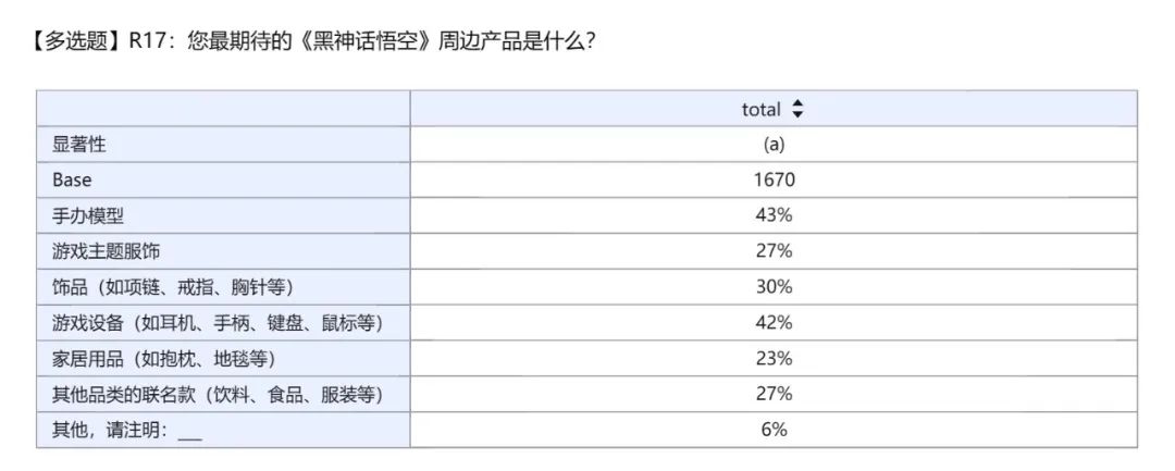 可见黑神话悟空的消费市场,还存在着巨大的发掘空间。这可能带来一些新的生意机会:比如云游戏能一定程度上解决设备问题,或许能激发观望人群的购买欲;品牌可以将自己的产品和游戏本体捆绑售卖,也能淡化单个产品的价格,促进购买……与游戏内容配套的IP衍生品开发,已经成为不少游戏的标配。受访者对于手办模型、游戏设备(如鼠标、键盘、手柄)表达出了非常高的兴趣。尽快推出黑神话悟空的IP衍生品,或许是个提振销量的好机会。