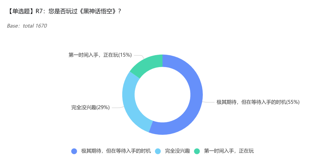 对此,快决测近期进行了一次1670名受访者参与的调研,他们来自全国各地,涵盖了Z世代到灰发族的各个年龄段——这是黑神话悟空爆火后,规模空前的一次专业市场调研。在这次调研中,我们窥见了消费者们如何看待黑神话悟空?是哪一点深深地吸引了他们?更重要的是,这款游戏爆火背后,又催生出哪些新的生意机会?1.出圈程度远超想象。不光是Z世代关注,灰发族也有不少人知道这款游戏;关注的主力虽然仍是男性,但本次受访者中不乏女性受众。游戏市场的人群洞察可能会经历一次洗牌。2.让人感到骄傲的“国产之光”。多数人对黑神话悟空态度积极,开心和骄傲是主流情绪,同时不反对让孩子接触这类优质的游戏。游戏“洪水猛兽”的形象逐渐改变。3.升级/购买游戏设备的意愿提升。多数人的设备不能流畅游玩,促生出升级/购买设备的需求,但仍有犹豫;而为了让伴侣玩游戏更爽,多数人愿意让伴侣添置游戏设备。对于PC、游戏主机、外设行业可能带来利好。4.IP的商业价值亟待发掘。多数人期待游戏相关的手办模型、游戏设备,黑神话悟空的IP衍生产品还有很大的价值发掘空间。