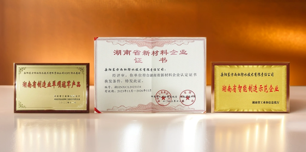 近年来,岳阳东方雨虹更是在专业优势及软硬实力的加持下,进一步推进环保、高效、智能的发展理念与科技研发、生产制造、施工运营、系统服务等各个生产经营管理环节的深度融合,在强化科技创新引领、深化可持续发展等方面取得一系列显著成果,先后获得“湖南省绿色工厂”“2022湖南制造业企业100强”“湖南省智能制造示范企业”“湖南省制造业单项冠军产品(岳阳东方雨虹防水技术有限责任公司HDPE防水卷材)”“湖南省新材料企业”等一系列奖项认证。