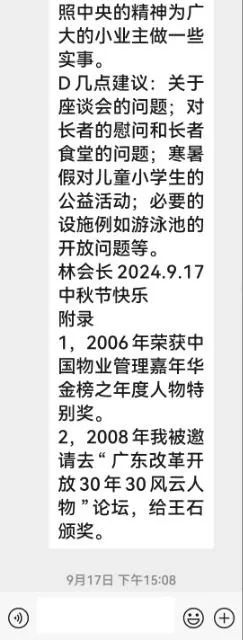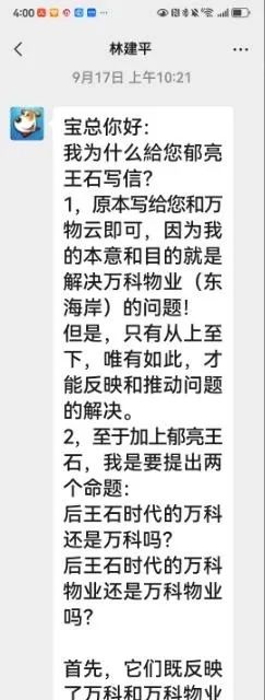 得知写信者是万科第一个项目天景花园的业主林老,也是天景花园第二、三、四届的业委会主任,后来购买万科东海岸一期,居住至今。