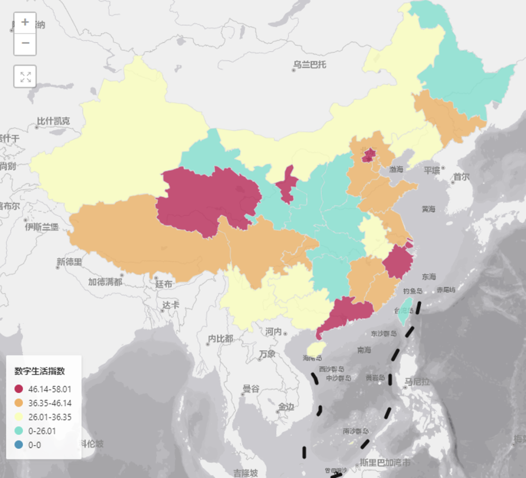 广西壮族自治区、云南省、辽宁省等11地数字生活指数在30分以下。