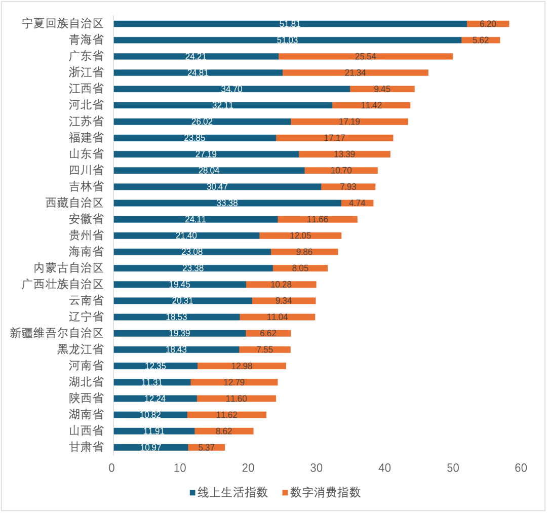 2024年全国27个省、自治区数字生活指数平均得分35.02分,较2023年提高1.18分。分地区看,宁夏回族自治区、青海省两地数字生活指数突破50分,创指数监测以来新高。从分指数看,两地受线上生活指数拉动明显,线上生活指数得分分别为51.81和51.03,在全国范围内具有显著优势,数字消费指数得分分别为6.2和5.62。