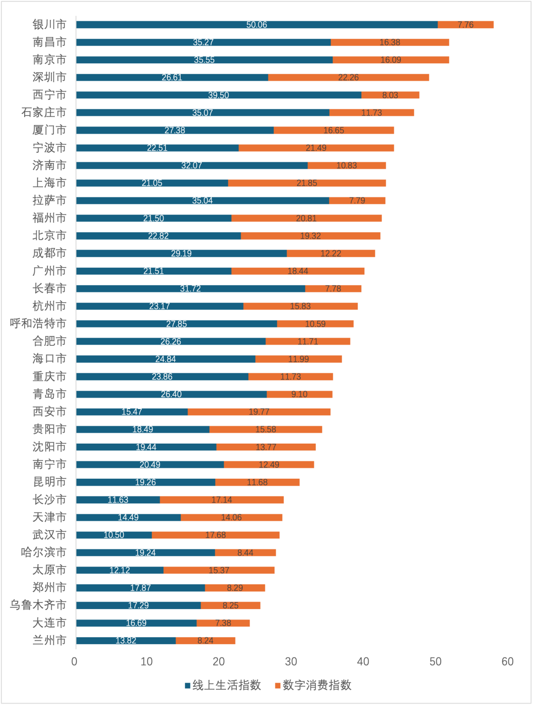 全国36个大中城市数字生活指数平均得分37.63分,较去年低3.16分。具体看,得分高于40的城市占39%,较去年低11个百分点;得分高于30的城市占75%。银川市、南昌市、南京市数字生活指数在50分以上,三个城市线上生活指数表现均优于数字消费指数,其中银川市线上生活指数得分为50.06分,数字消费指数得分7.76分。和各省、直辖市相比36个大中城市数字消费水平较高。