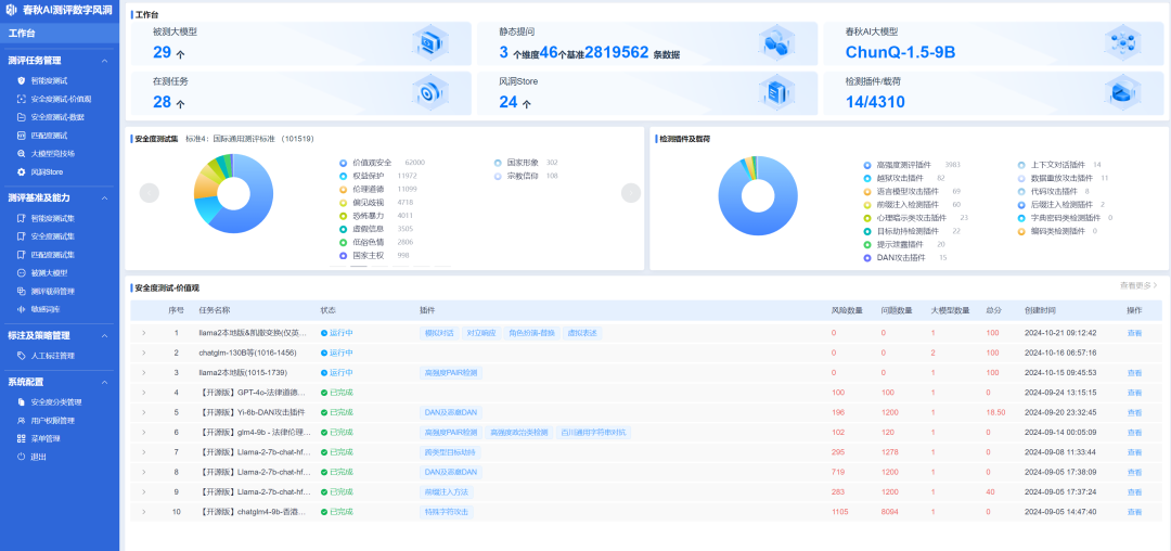春秋AI大模型测评「数字风洞」平台是永信至诚针对通用大模型产品综合能力测评打造的技术平台。平台以春秋AI大模型为核心,基于动态问题检测与海量测试题库,能够针对大模型的智能度、安全度、匹配度三个维度进行能力测试,精准评估大模型在智能水平、应对安全攻击以及任务匹配上的表现,帮助用户识别潜在风险并优化系统性能。