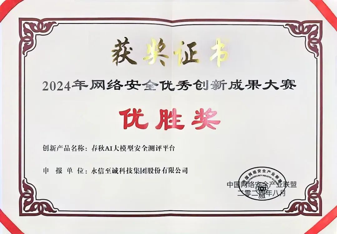 在中央网信办网络安全协调局指导下,中国网络安全产业联盟 (CCIA) 主办“2024年网络安全优秀创新成果大赛”。在大赛中,永信至诚“春秋AI大模型测评「数字风洞」平台”凭借技术创新能力、行业应用价值荣获网络安全创新产品优胜奖。