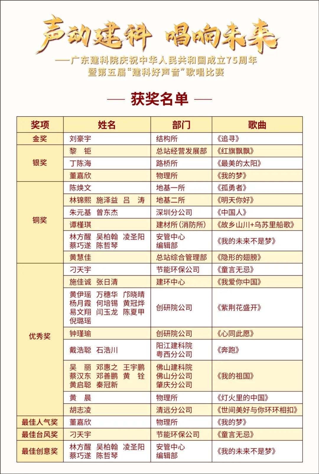 最终,声动建科 唱响未来——广东建科院庆祝中华人民共和国成立75周年暨第五届“建科好声音”歌唱比赛”诞生了金奖、银奖、铜奖、优秀奖、最佳台风奖、最佳创意奖、最佳人气奖。(详见文末的获奖名单)