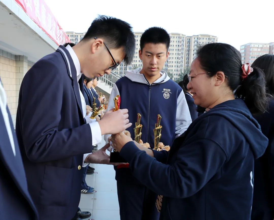 第十八届国旗方队的队员们如今已经升入高二,完成了一年的执勤工作。升旗仪式上,校长田俊老师和高二学部李红玉老师为第十八届国旗方队队员颁发了奖杯、奖状和校服熊,感谢同学们的辛勤付出。