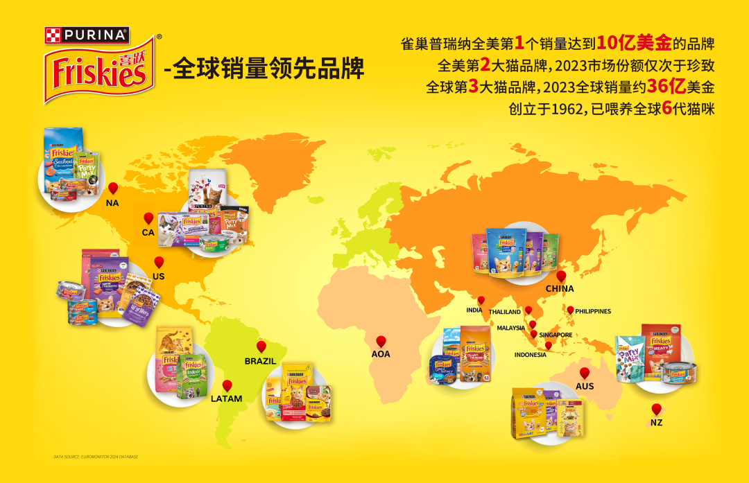 喜跃Friskies®创立于1962年,已喂养全球6代猫咪,是全球销量领先品牌,是雀巢普瑞纳全美第1个销量达到10亿美金的品牌,全美第2大猫品牌,2023市场份额仅次于珍致,全球第3大猫品牌,2023全球销量约36亿美金。