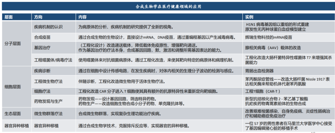合成生物学在医疗健康领域的应用广泛,包括创新治疗疗法(细胞免疫疗法、RNA药物、微生态疗法、基因编辑相关应用)、体外检测、医疗耗材、药物成分生产和制药用酶等诸多方向。合成生物学在医疗健康多个细分领域得到广泛应用。不仅可以通过设计全新的细胞内代谢途径,使医药产品能够通过微生物细胞利用廉价糖类等原料进行合成,还可以根据不同的疾病和致病机制,进行人工设计、构建适宜的治疗性基因回路,在载体的协助下植入人体,通过纠正机体有功能缺陷的回路,实现治疗疾病的目的。