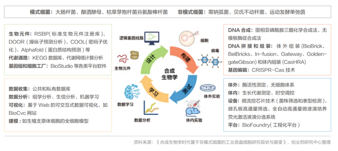 合成生物学产业关键环节包括菌株设计改造、工艺开发、工业化量产和终端产品的交付,分为大致的上、中、下游。
