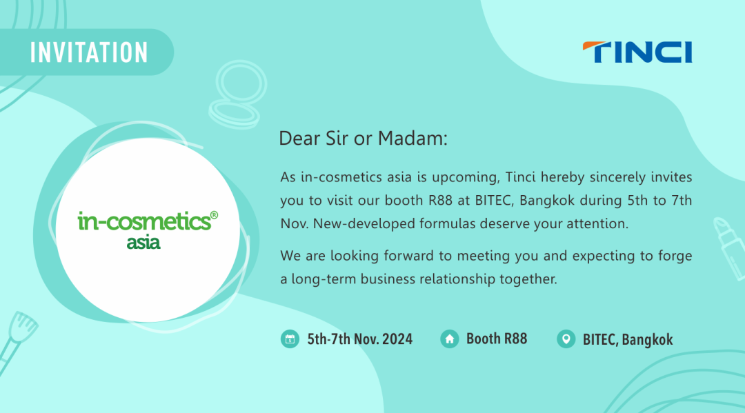 又是一年In-Cosmetics Asia展会,2024年11月5号-7号在泰国曼谷,天赐材料在展位:R88期待与您的再次相见。