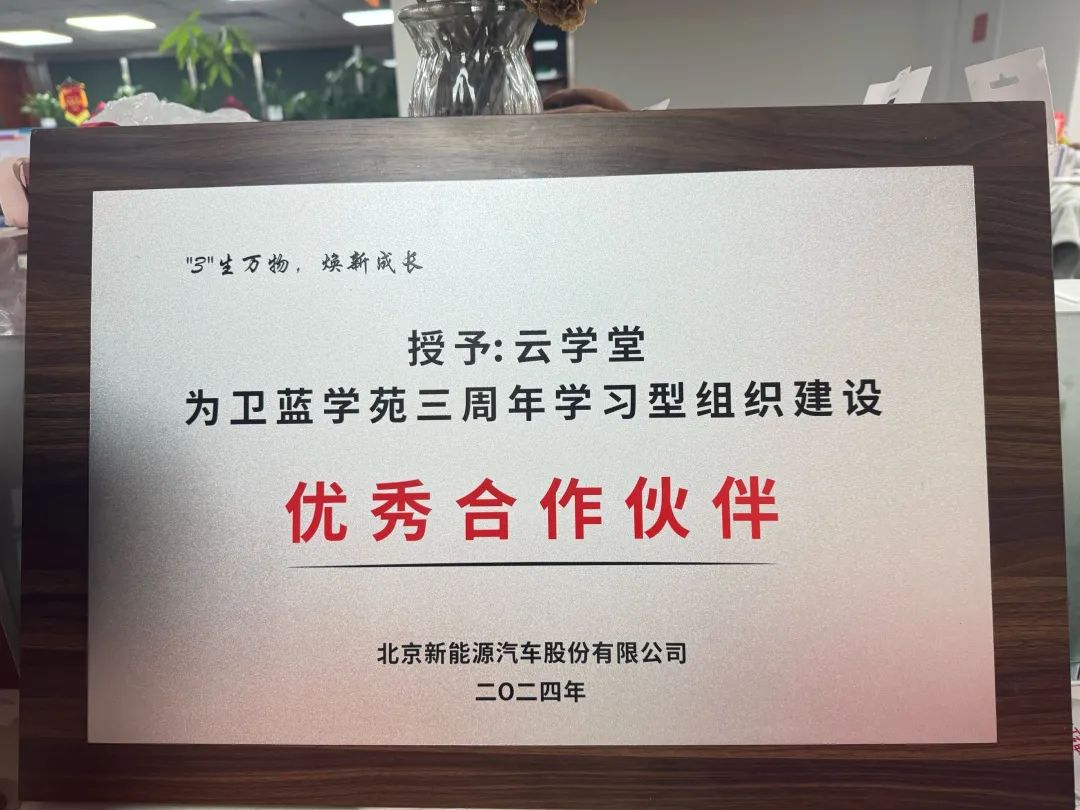 近日,北汽新能源学习平台卫蓝学苑迎来了三周年庆典,云学堂荣获北汽新能源汽车股份有限公司颁发的“优秀合作伙伴奖”,这一荣誉充分彰显了双方紧密而成功的合作关系,更是北汽新能源对云学堂创新能力与专业服务的高度认可。来自北汽新能源、北京奔驰培训中心、云学堂等多位嘉宾出席了此次活动,共同见证了北汽新能源学习型组织的建设历程。云学堂作为一家专注于为客户提供数字化企业学习解决方案的科技企业,自与北汽新能源合作以来,一直致力于为卫蓝学苑的搭建和运营提供强大支持,在卫蓝学苑从无到有、从构想到现实的发展过程中,始终陪伴卫蓝学苑的成长和完善。在庆典活动中,北汽新能源对云学堂的贡献给予了高度评价。云学堂为卫蓝学苑提供了先进的技术支持,确保学习平台稳定运行和高效性能。同时,凭借其丰富的行业经验和专业团队,云学堂为北汽新能源量身定制了个性化的学习解决方案,满足了企业多样化的培训需求。此外,云学堂快速的客户响应和优质的服务态度,也赢得了北汽新能源的信任和赞誉。未来,云学堂将继续秉承 “以客户为中心” 的理念,持续创新,深化合作,为北汽新能源提供更加专业、高效、智能的学习解决方案,助力卫蓝学苑提升培训效果,为企业发展培养更多高素质人才,推动北汽新能源在行业中取得更加优异的成绩。