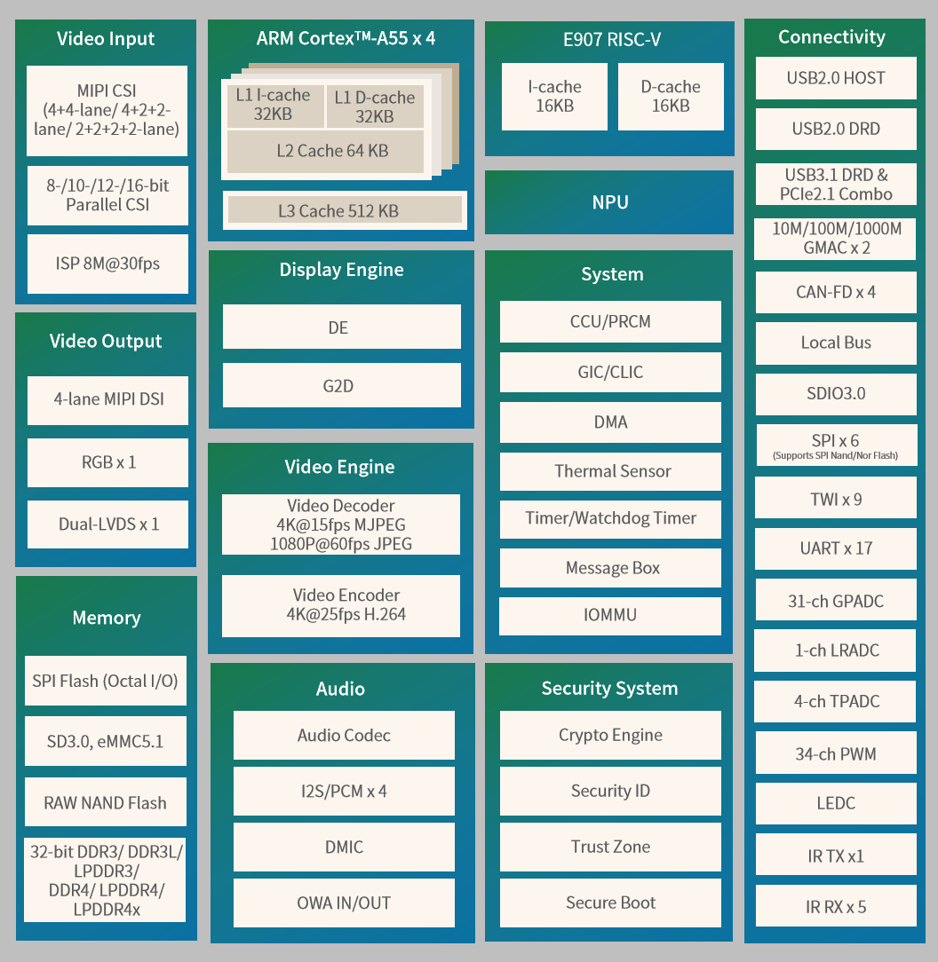 T536是一颗针对工业控制及智慧能源等领域研发的芯片,芯片集成4核ARM Cortex-A55 CPU、双RISC-V MCU、3T NPU等丰富的算力,并有包括4路CAN-FD在内的丰富接口,可以满足工业场景常见的算力和接口要求。在视觉图像方面,T536搭载了自研的编解码模块和AI ISP,配套了一系列适用于工业领域的算法。同时,芯片适配针对工业场景设计的全新Tina AIoT OS平台,配合AMP架构,可以满足工业场景异构、高实时性和高可靠性的需求。在安全方面,T536基于ARM TrustZone实现可信执行环境,支持通用加密和国密算法,并支持ECC全通路数据校验及纠错。T536满足-40°C~85°C工作温度、10年以上工作寿命和不良率低于100ppm的质量标准,可以满足工业级产品的质量要求。