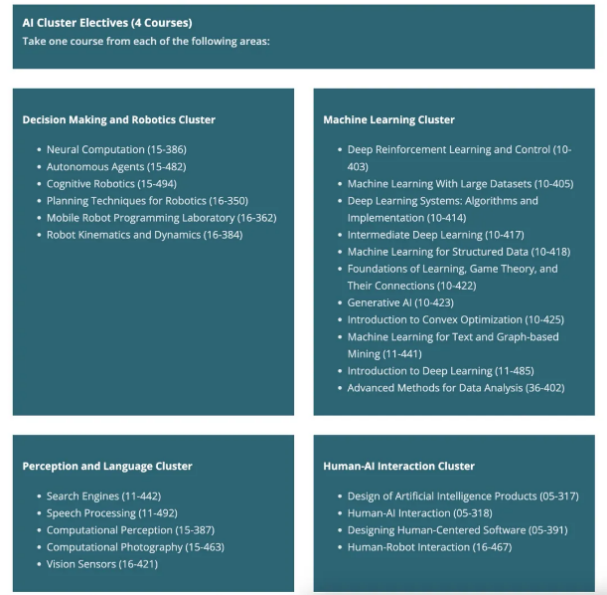 以卡耐基梅隆大学人工智能专业为代表,其开设了决策与机器人、机器学习、感知和语言、人机交互四类选修单元,每一类别下至少有 4 门课程供学生选择。