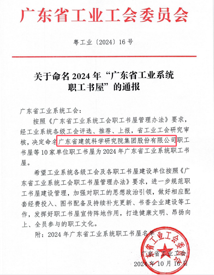 近日,广东省工业工会委员会发布了《关于命名2024年“广东省工业系统职工书屋”的通报》,广东建科院职工书屋成功获评2024年“广东省工业系统职工书屋”。