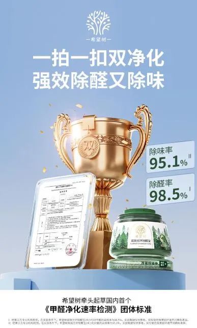 此次标准的发布,标志着我们在推动分解式空气净化产品检测标准化方面迈出了重要一步。我们一直致力于产品研发,最近推出了希望树双效除醛宝,添加了白桦树汁提取物,具备除醛除味双效功能。该产品在24小时内除醛速率达98.5%,除味速率达95.1%,双效守护长达90天。