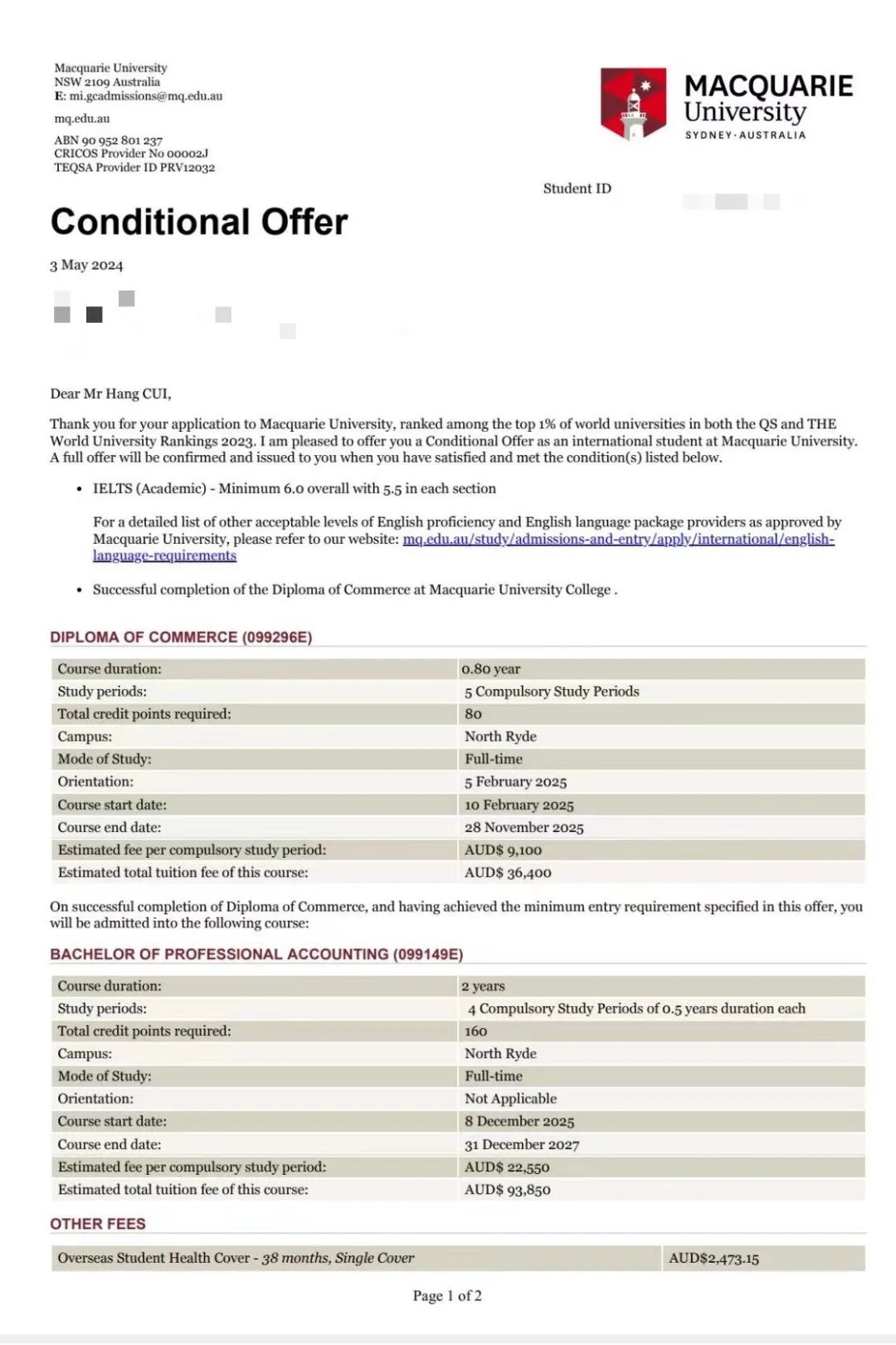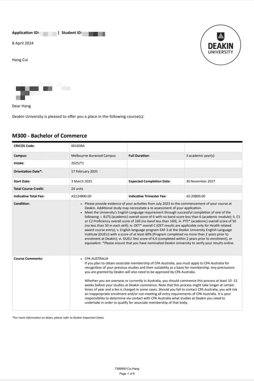 现已收到麦考瑞大学、迪肯大学、唐道克理工学院offer