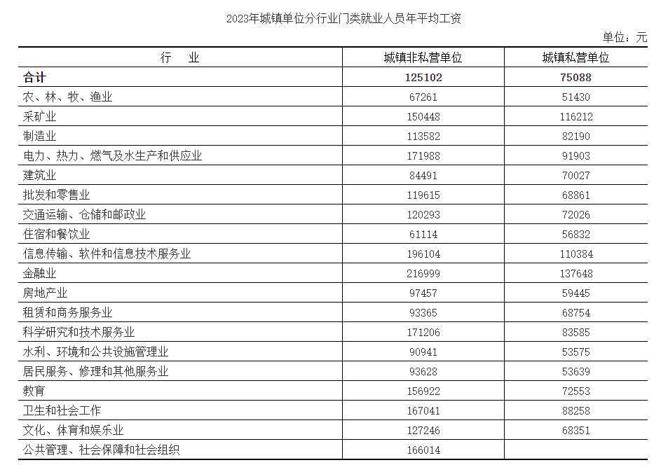 2023年,江苏省城镇非私营单位就业人员年平均工资为125102元,其中,在岗职工年平均工资为127620元;城镇私营单位就业人员年平均工资为75088元。分行业门类的城镇单位就业人员年平均工资详见下表。