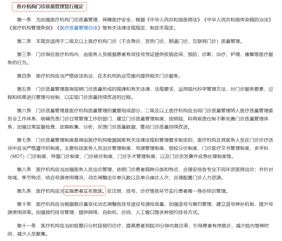 国家卫健委办公厅在这一规定的第九条提出,医疗机构应当实施患者实名就医,在注册、挂号、诊疗等各环节实行患者唯一身份标识管理。这一系列政策让我们的实名制就医制度更具规范性和权威性。